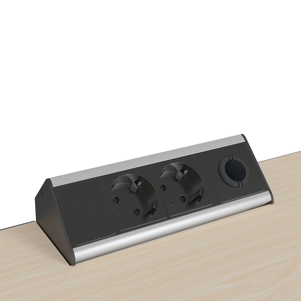 935-I2M0 – настольная врезная розеточная станция Axessline с 2 розетками и отверстием под кабель диаметром 10,6 мм. Монтаж к столу: врезной, в край стола. Максимальная толщина столешницы: 26 мм. Напряжение: 250 В. Длина кабеля питания: 1,5 м. Цвет серебристый с черным.