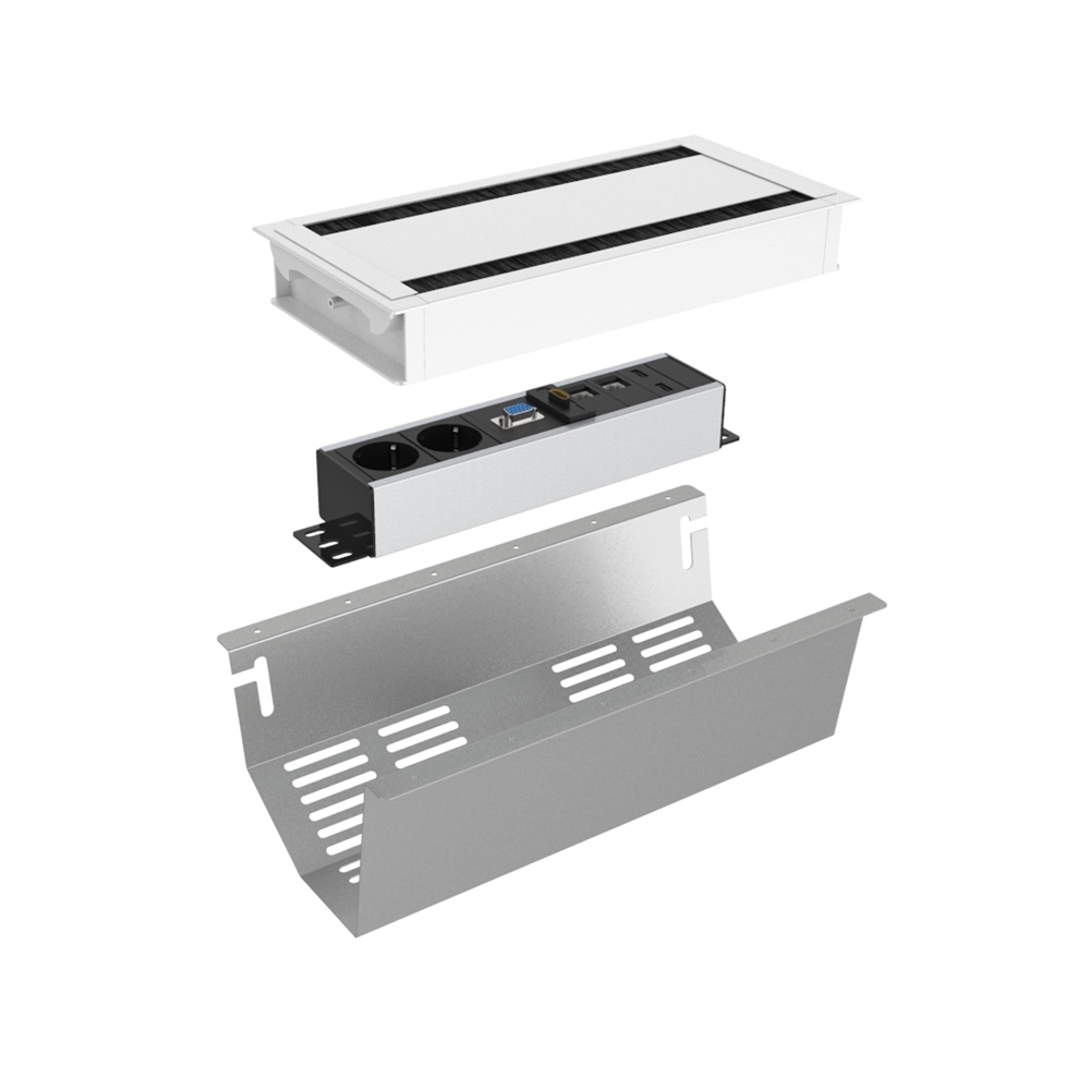 935-K44CW – розеточная станция серии Axessline для установки под стол с встраиваемым в столешницу лючком. Цвет белый.