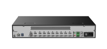 DSCON2100-0416H – встраиваемый контроллер видеостены с 16 выходными каналами HDMI. Может создавать видеостены разных конфигураций. Доступен многооконный режим для каждого экрана, до 9 окон. Поддержка входных разрешений до 4К60 и выходных разрешений до 1080p60, также есть поддержка пользовательских разрешений на выходе. Декодирует 1 канал 32 Мп, 2 канала 12 Мп, 4 канала 8 Мп, 8 каналов 4 Мп или 16 каналов 2 Мп.