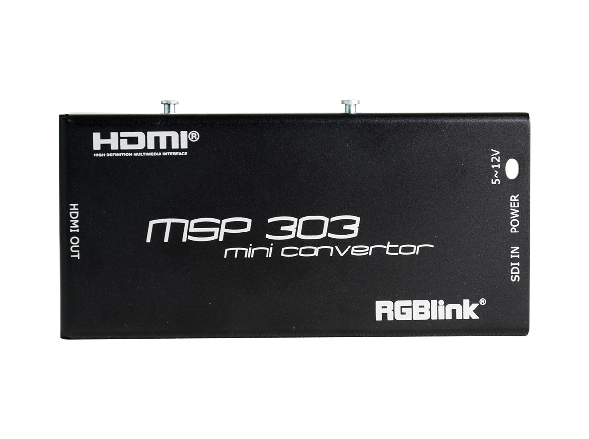 MSP 303 – преобразователь видеосигнала SD/HD/3G-SDI в HDMI 1.3. Поддерживает сигналы разрешением до 1080p60 на входе и до 1080p60 / 1920x1080, 60 Гц на выходе.