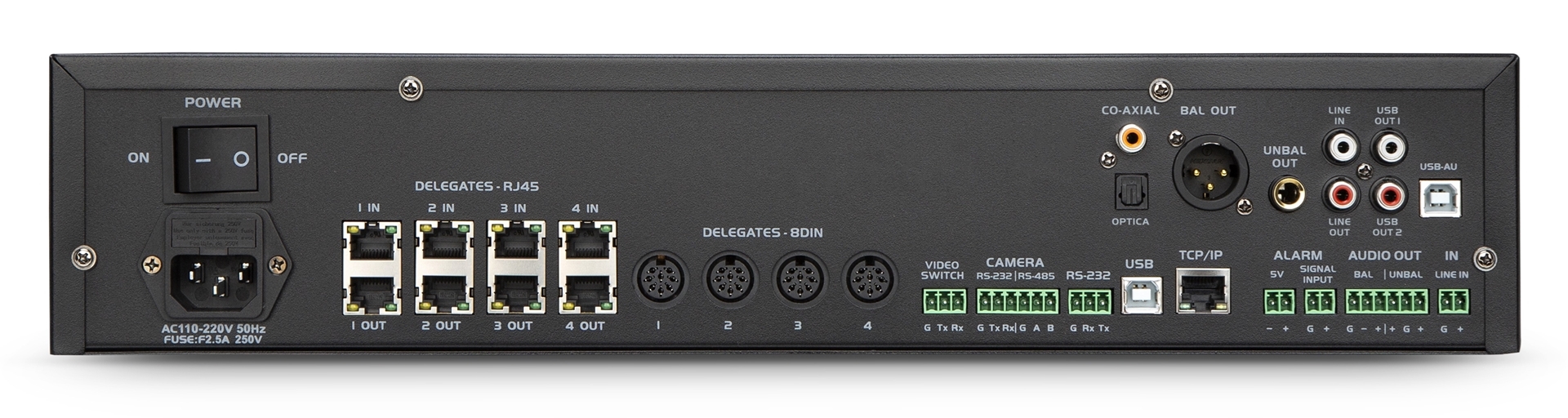 QCC W8630 – контроллер для камер и микрофонных пультов конференц-системы. Максимальное число подключаемых пультов: 120 (расширение до 1200). Встроенный DSP-процессор для обработки аудиосигнала. Передняя панель оснащена 5" сенсорным дисплеем. Порт USB для записи аудио и подключения к ПК. Вход небалансного аудио, выходы балансного и небалансного аудио. 20 запасных РЧ-каналов для избежания помех. Для управления используются протоколы RS-232 и RS-485. Позволяет регистрировать участников на встрече, проводить голосование. Может устанавливаться в рэковую стойку.