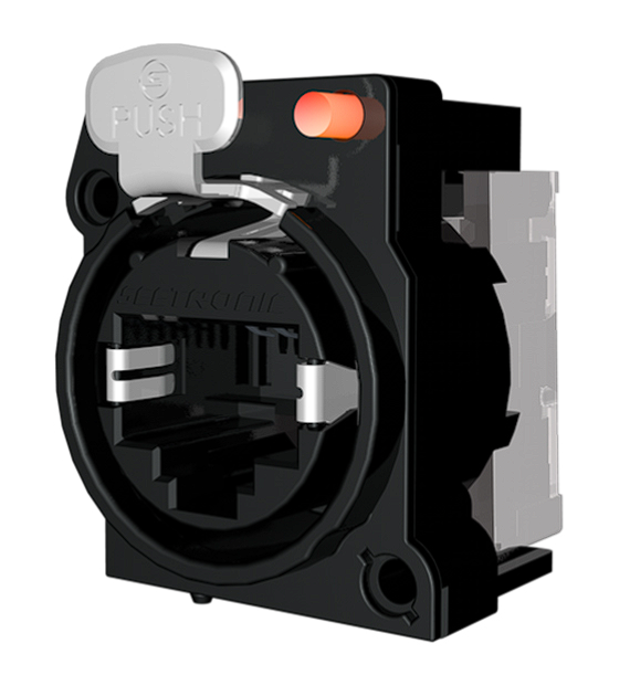 SE8FAH-C6-LED – панельный разъем etherCON RJ45 (розетка) с фиксацией и фланцем типа D. Устанавливается на горизонтальную печатную плату. Корпус из пластика. Контакты покрыты золотом, под пайку. Максимальная толщина панели: 3 мм. Оборудован двумя светодиодами на передней панели.