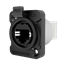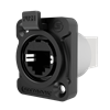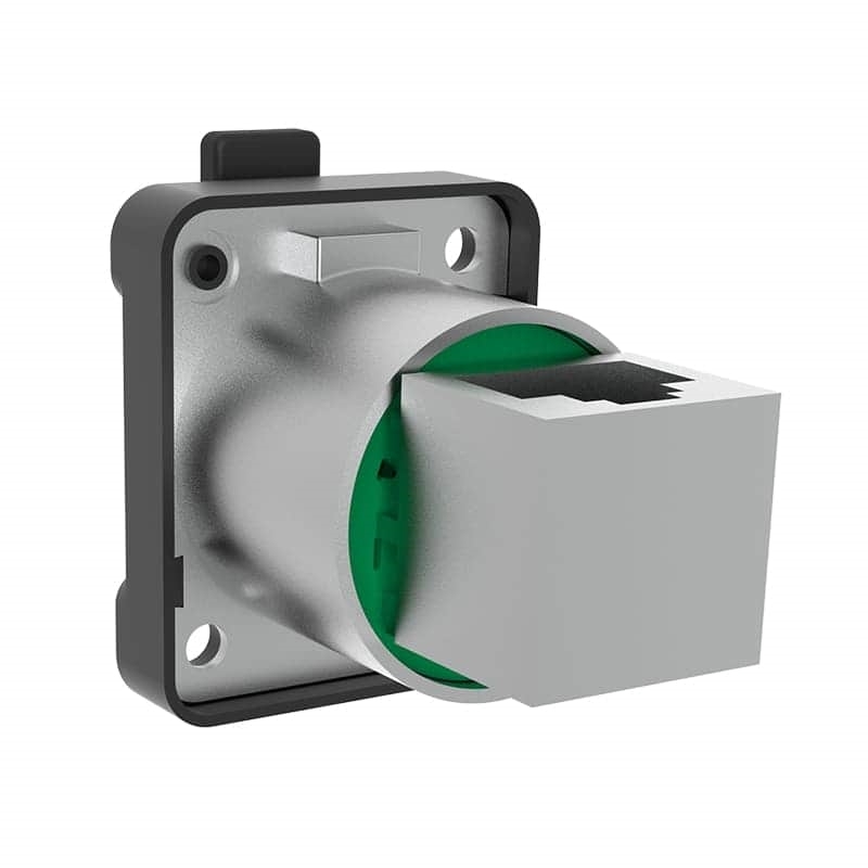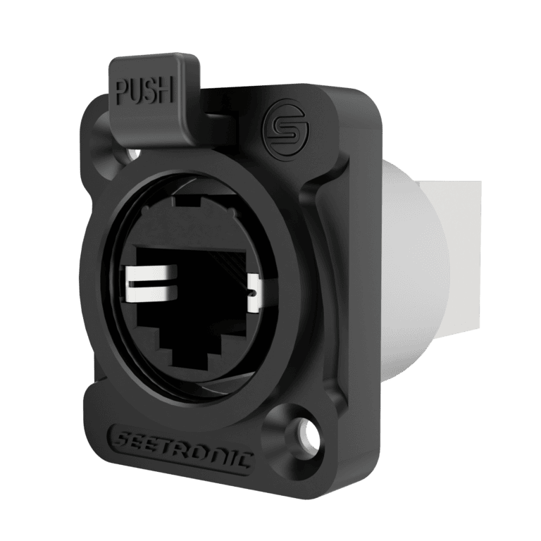 SE8FDYH-60-B – проходной панельный разъем etherCON RJ45 CAT5e (розетка-розетка) с фланцем типа D и водонепроницаемой заглушкой. Корпус с защитой класса IP65. Устанавливается на переднюю сторону панели. Разъем на задней части развернут вверх. Контакты покрыты золотом. Цвет корпуса серебристый.