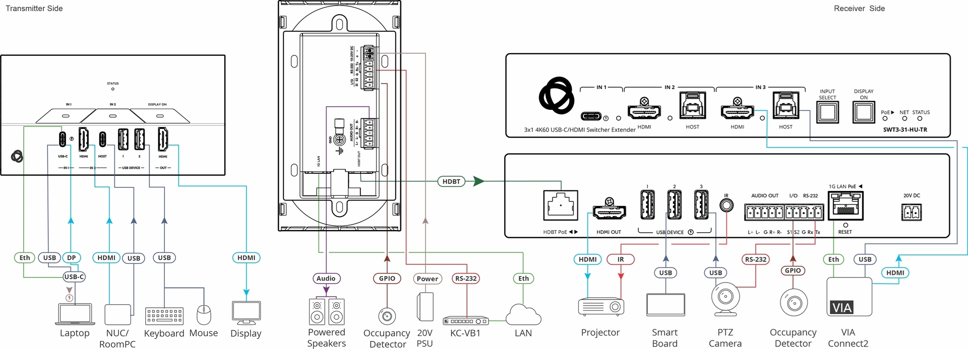 1 – HDMI, тип А (розетка) 1 – витая пара HDBaseT, разъем RJ-45 (розетка) 1 – балансное стереоаудио, клеммный блок |