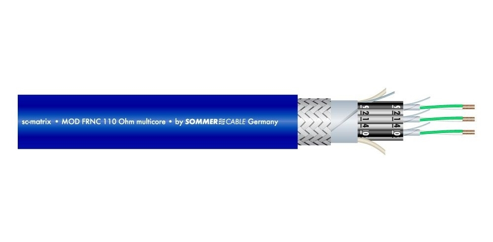 100-0302-16 – мультипарный аудиокабель (мультикор) [AES/EBU] серии MATRIX MMC 16. Содержит 16 витых пар многопроволочных жил из бескислородной меди (OFC) сечением 0,25 кв.мм. Каждый канал в своем экране из AL/PT фольги и в оболочке из HM2. Общий для всех кабелей плетеный экран и FRNC-оболочка из HM2. Диаметр кабеля 21,5 мм, цвет темно-синий.