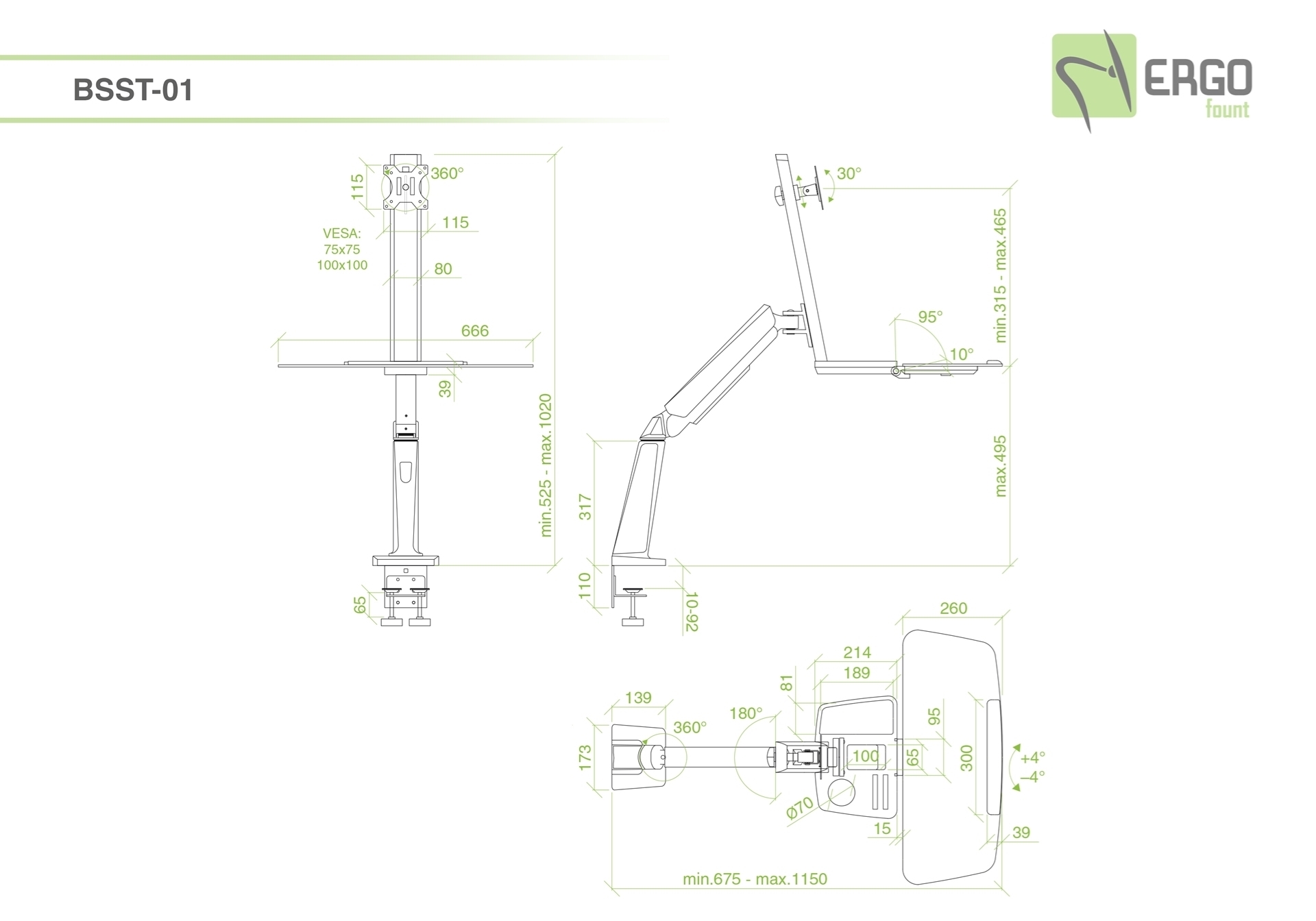 ПРИЧИНА УЦЕНКИ: Потертости. Не хватает крепежа для монтажа прибора путем сверления столешницы (позиции G, M, N, O, P, Q) ДОП СКИДКА: +5% к вашей дилерской скидке. BSST-01 – настольное рабочее место, шарнирный кронштейн для монитора диагональю 13–32''. Есть органайзер для мелочей и полка под клавиатуру. Стандарт VESA 75х75, 100х100. Вращение: 360°. Поворот: ±90°. Наклон: ±15°. Рабочая поверхность полки под клавиатуру: 666х260 мм. Ручная регулировка высоты в пределах 1020 мм. Монтаж: струбцина или зажим. Материал: алюминий, пластиковая декоративная отделка, полка из МДФ с ПВХ. Максимальная нагрузка: 8 кг на VESA, 1 кг на полку.