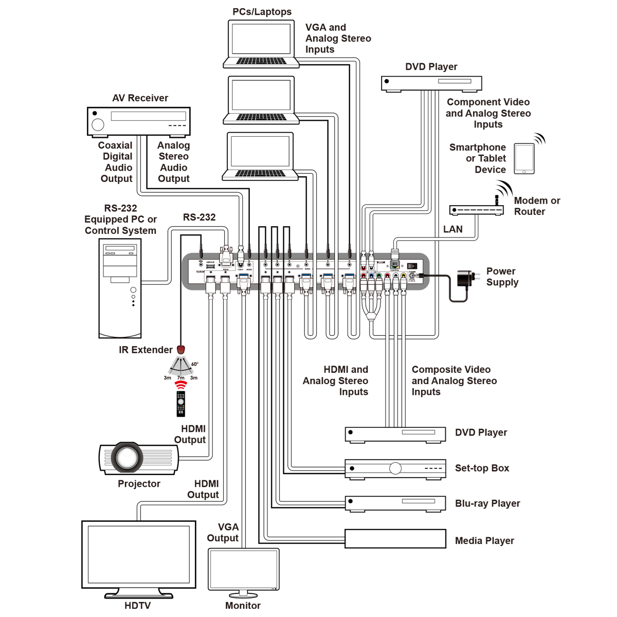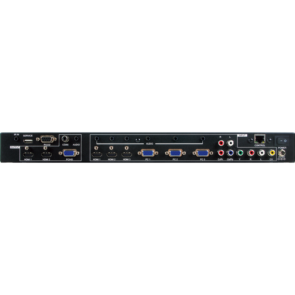 3 – HDMI, тип A (розетка) 3 – VGA, разъем D-Sub HD15 (розетка) 1 – YPbPr / YCbCr, разъемы 3xRCA (розетка) 1 – CV, разъем RCA (розетка) 2 – аудиостерео, разъемы 2xRCA (розетка) 6 – аудиостерео, разъем miniJack 3,5 мм (розетка) |