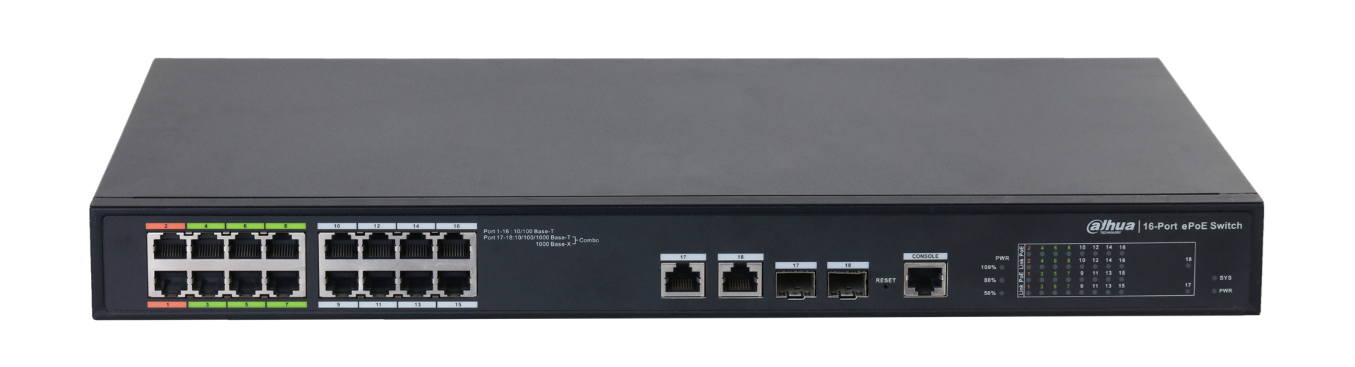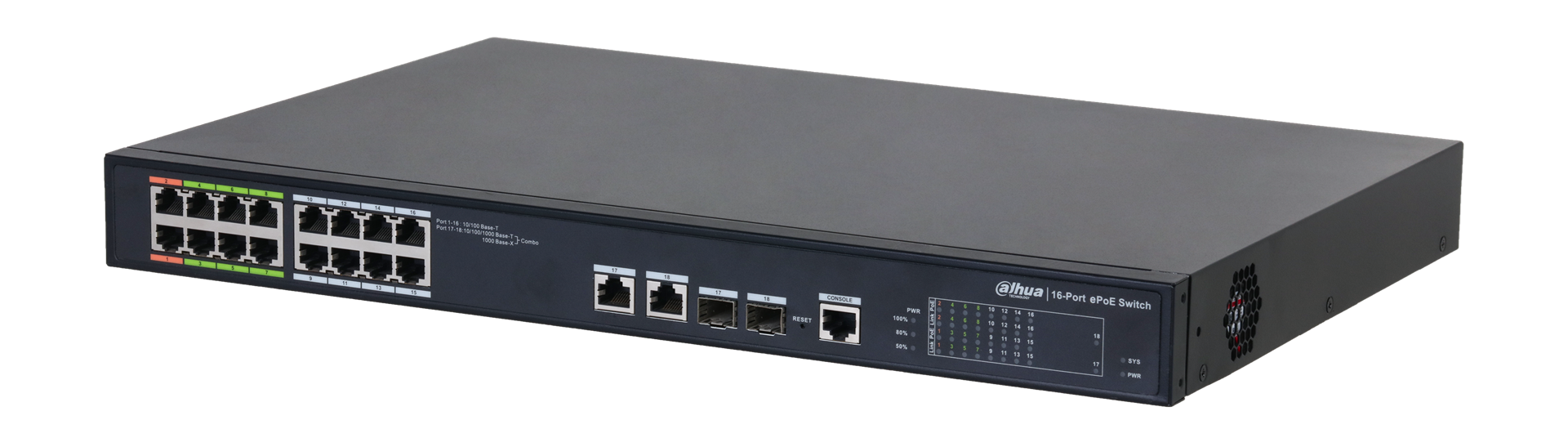 DH-LR2218-16ET-240 – управляемый сетевой коммутатор второго уровня с шестнадцатью портами 10/100 Мбит/с и двумя комбинированными портами: 10/100/1000 Мбит/с RJ45 + SFP 1000 Мбит/с. Коммутационная способность: 8,8 Гбит/с. Суммарная мощность питания: до 240 Вт. Восемь портов для передачи питания PoE, восемь портов для питания ePoE. Передача питания ePoE возможна на расстояние до 800 м.
