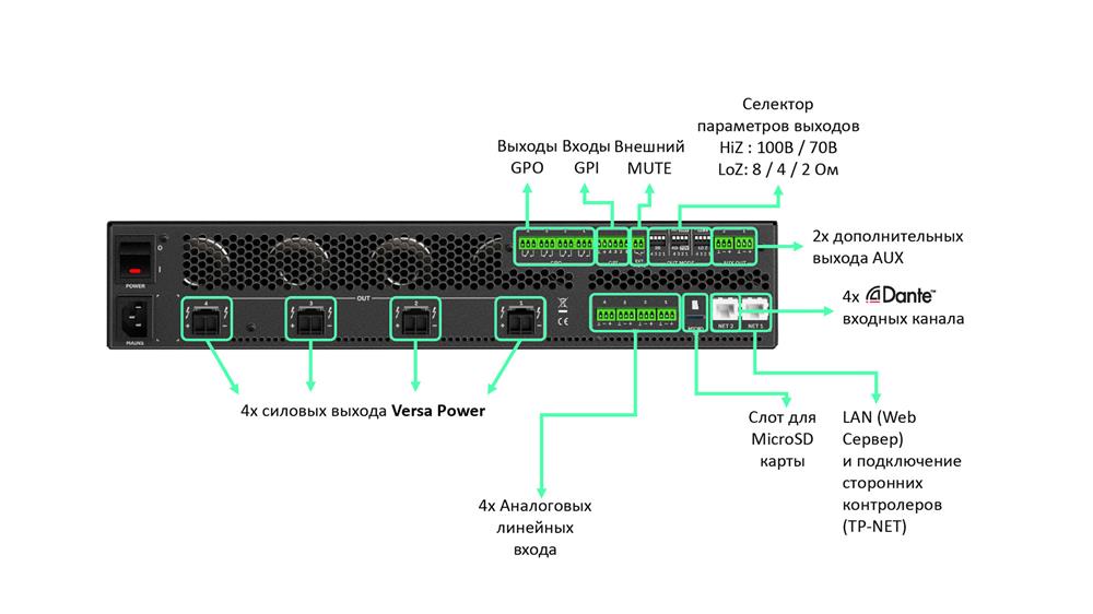 Еще один момент, про который мы пока не упоминали, — это интеграция AV-over-IP через Dante (4×4). Этот интерфейс обеспечивает не только передачу аудиосигнала, но и гибкую маршрутизацию с возможностью копирования потоков до и после цифровой обработки. В крупных инсталляциях, таких как отели или кампусы, это позволяет выстраивать единую аудиосеть: сигналы от источников, микрофонов или DSP могут свободно распределяться между зонами, а сама система легко масштабируется без изменения физической инфраструктуры.