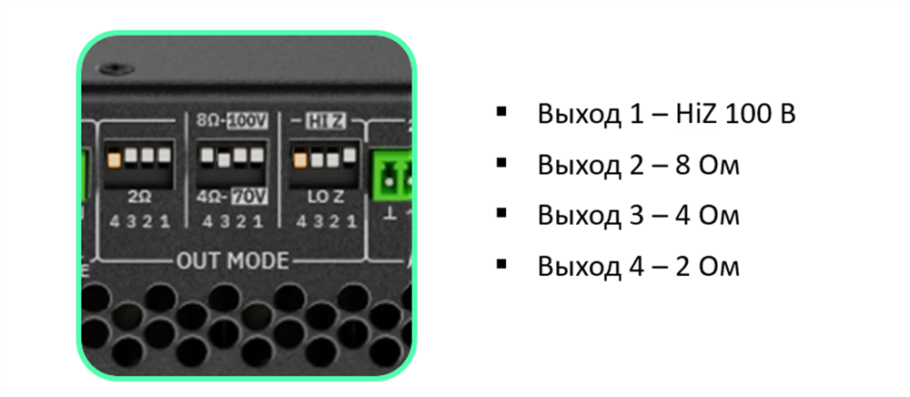 Гибкость серии не ограничивается одной уникальной работой с мощностью. Каждый выход VIDA можно также независимо настроить как под трансляционные линии 70/100 В, так и под низкоомные нагрузки 2, 4 или 8 Ом, т.е., по сути, усилители этой серии могут одновременно работать с громкоговорителями всех существующих стандартов. А значит проект не придется делить на разные подсистемы с отдельными усилителями. Одного устройства будет вполне достаточно, чтобы одновременно обслуживать, например, основной зал фитнес-клуба с низкоомной акустикой и небольшие зоны раздевалок с 100-вольтовой линией, без усложнения схемы подключения.