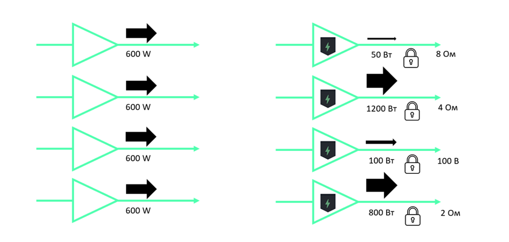 Ключевое отличие VIDA от большинства представленных на рынке усилителей — асимметричное распределение мощности. В традиционных моделях мощность жестко закреплена за каждым каналом, что ограничивает сценарии использования. В серии VIDA реализована технология VersaPower, позволяющая распределять общий ресурс (1600, 2400 или 4800 Вт в зависимости от модели) между четырьмя выходами и поручать распределение автоматике. Это означает, что один канал может получить большую часть мощности, в то время как остальные работают в облегченном режиме.