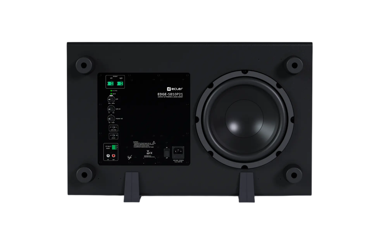 EDGE-SB10P21 – активный сабвуфер с 10" драйвером и номинальной мощностью 120 Вт. Оборудован двумя выходами, каждый мощностью 100 Вт (4 Ом), для подключения внешних акустических систем, что позволяет сконфигурировать аудиосистему 2.1. Оборудован фазоинвертором и регулируемым фильтром нижних частот 50–250 Гц. Может устанавливаться на стену при помощи пары кронштейнов (прилагаются), а также размещаться вертикально и горизонтально на полу (съемные ножки и подставки входят в комплект). Цвет корпуса черный.