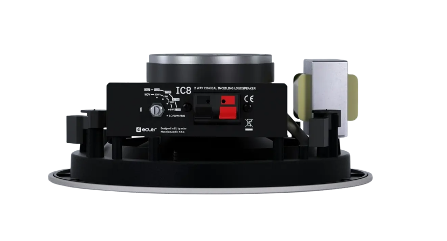 IC8iWH – двухполосная встраиваемая акустическая система с 8'' драйвером для низких частот и 1'' твитером. Развивает эффективную мощность до 60 Вт RMS при подключении в режиме 8 Ом. Оснащена 100-вольтовым линейным трансформатором, имеются отводы мощности на 5, 7.5, 15, 30 Вт (при 100 В). Угол раскрытия АС 152° (конусообразный). Цвет корпуса белый. Поставляется парами.
