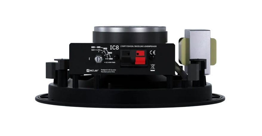 IC8iBK – двухполосная встраиваемая акустическая система с 8'' драйвером для низких частот и 1'' твитером. Развивает эффективную мощность до 60 Вт RMS при подключении в режиме 8 Ом. Оснащена 100-вольтовым линейным трансформатором, имеются отводы мощности на 5, 7.5, 15, 30 Вт (при 100 В). Угол раскрытия АС 152° (конусообразный). Цвет корпуса черный. Поставляется парами.