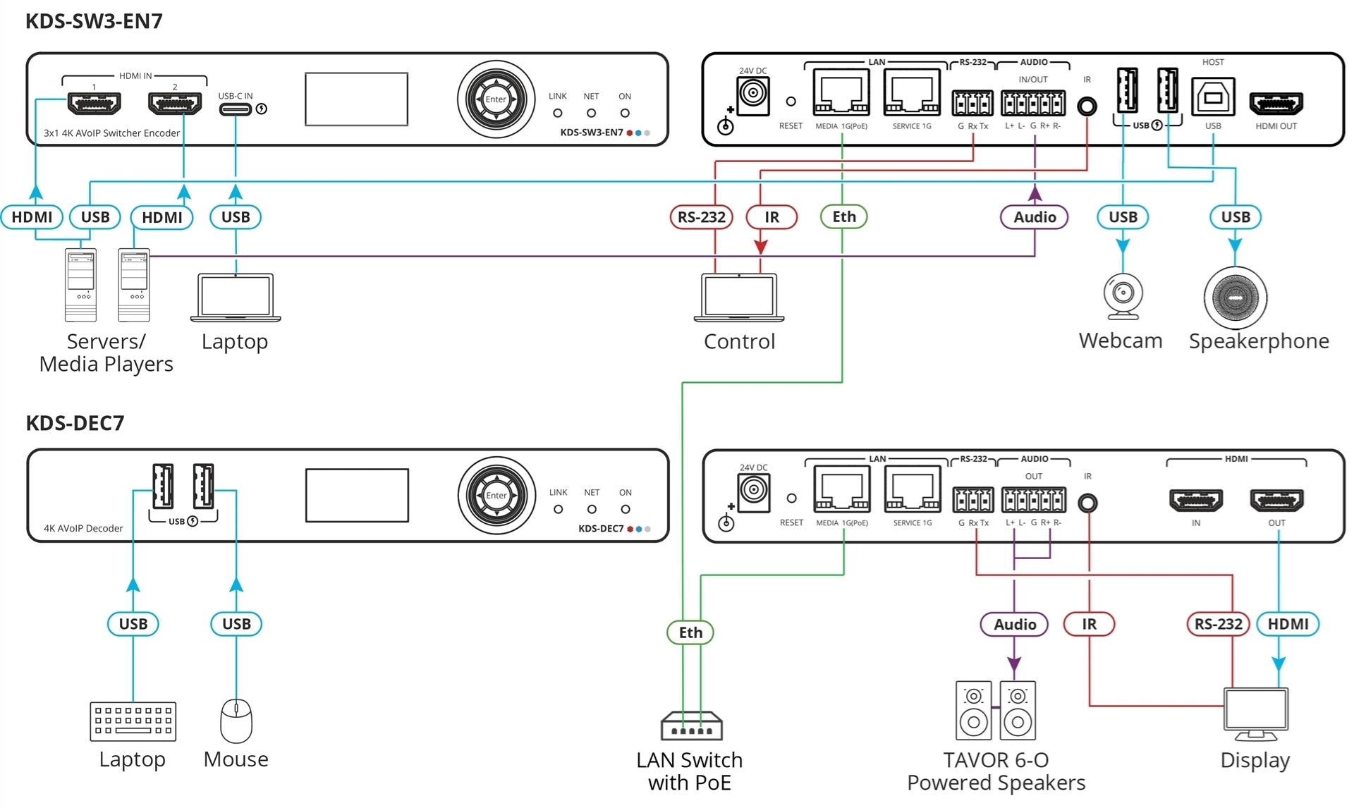 KDS-SW3-EN7 – кодер и передатчик в сеть Ethernet сигналов HDMI с разрешением до 4K/60 Гц (4:2:0), аудио, RS-232, ИК и USB. Можно выбирать один из входов: 2хHDMI или USB-C. Оснащен проходным выходом HDMI. Производит преобразование сигналов HDMI, эмбеддированного аудио, RS-232, ИК и USB в цифровой поток, передаваемый по сети IP на основе витой пары в режиме Unicast или Multicast. Устройство также способно производить кодирование аудиосигнала в IP-поток Dante. Управление по IP, KDS-7-MNGR. Совместимый приемник: KDS-DEC7.