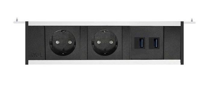 2M80F2A3 – розеточная станция серии Level тип F (Level-F): 2 розетки (Schuko); 1xUSB, тип А; 1xUSB, тип C. Разъем для кабеля питания GST18i3 (розетка). Может крепиться шурупами под столешницу, в углу. Блок розеток и торцевые накладки белого цвета, боковые рамки – серебристые.