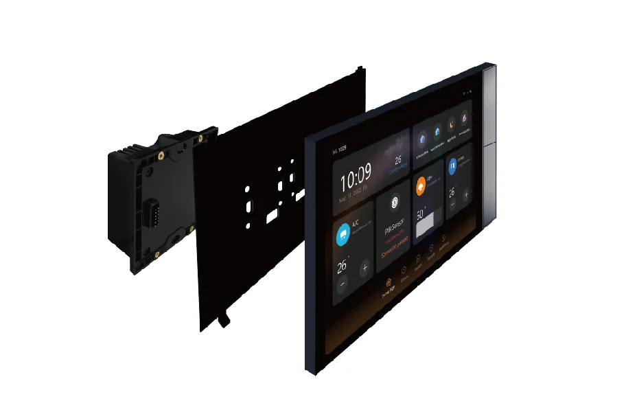 Настенная / Настольная панель 10 дюймов (un-10s9e) – сенсорная встраиваемая панель управления, оборудованная 4'' дисплеем с поддержкой мультитач. Работает под управлением ОС Android. Разрешение дисплея: 1920x1200. Есть встроенный микрофон и два динамика мощностью 2 Вт каждый. Для подключения могут использоваться Wi-Fi и Bluetooth. Расстояние между отверстиями для болтов: 60 мм. Габаритные размеры (ШхГхВ) с основанием и без: 272 x 155 x 11,5 (38) мм.
