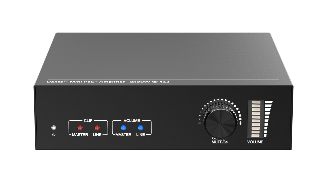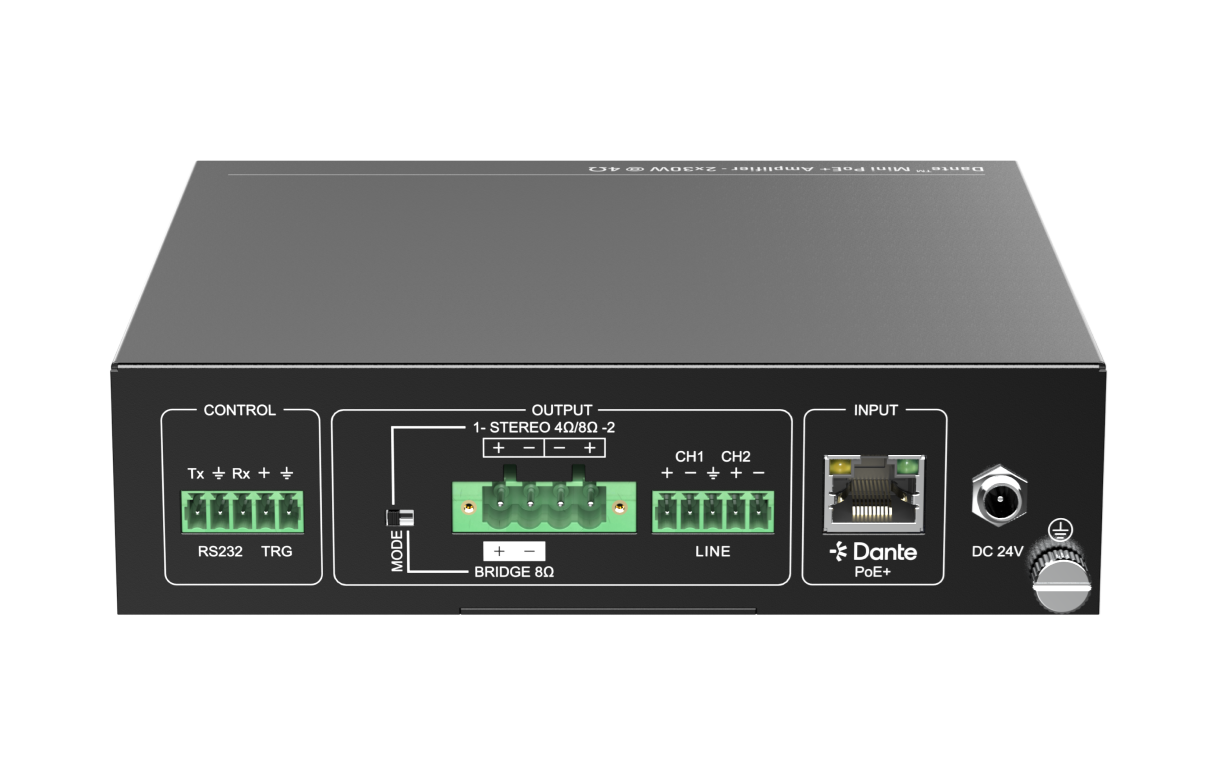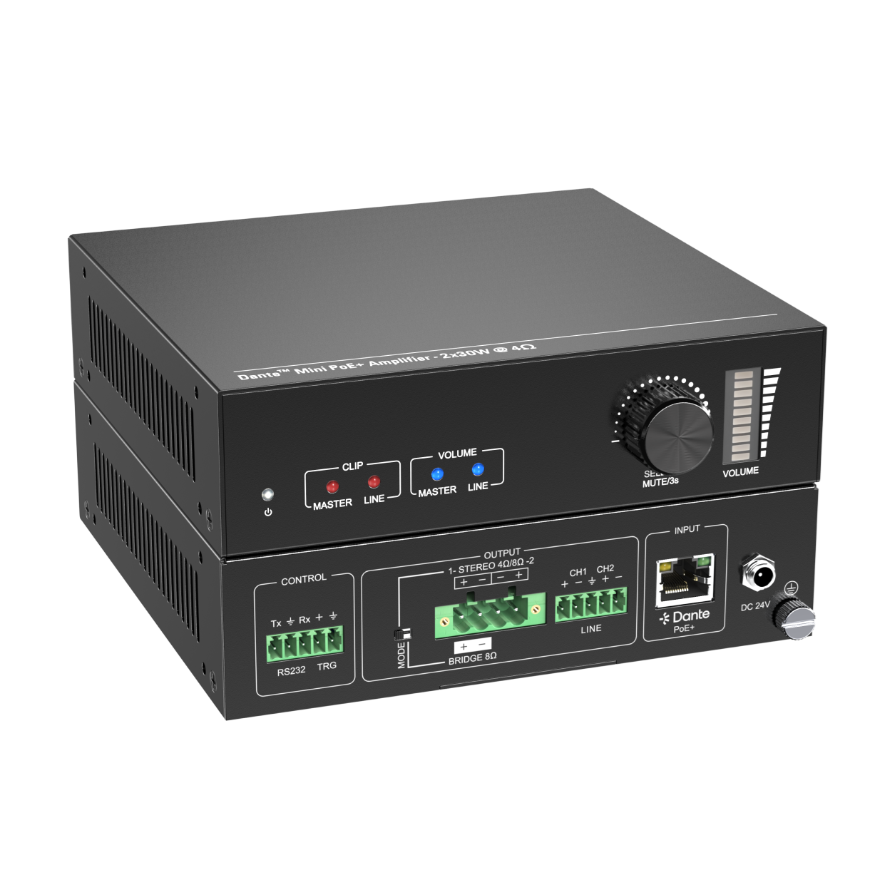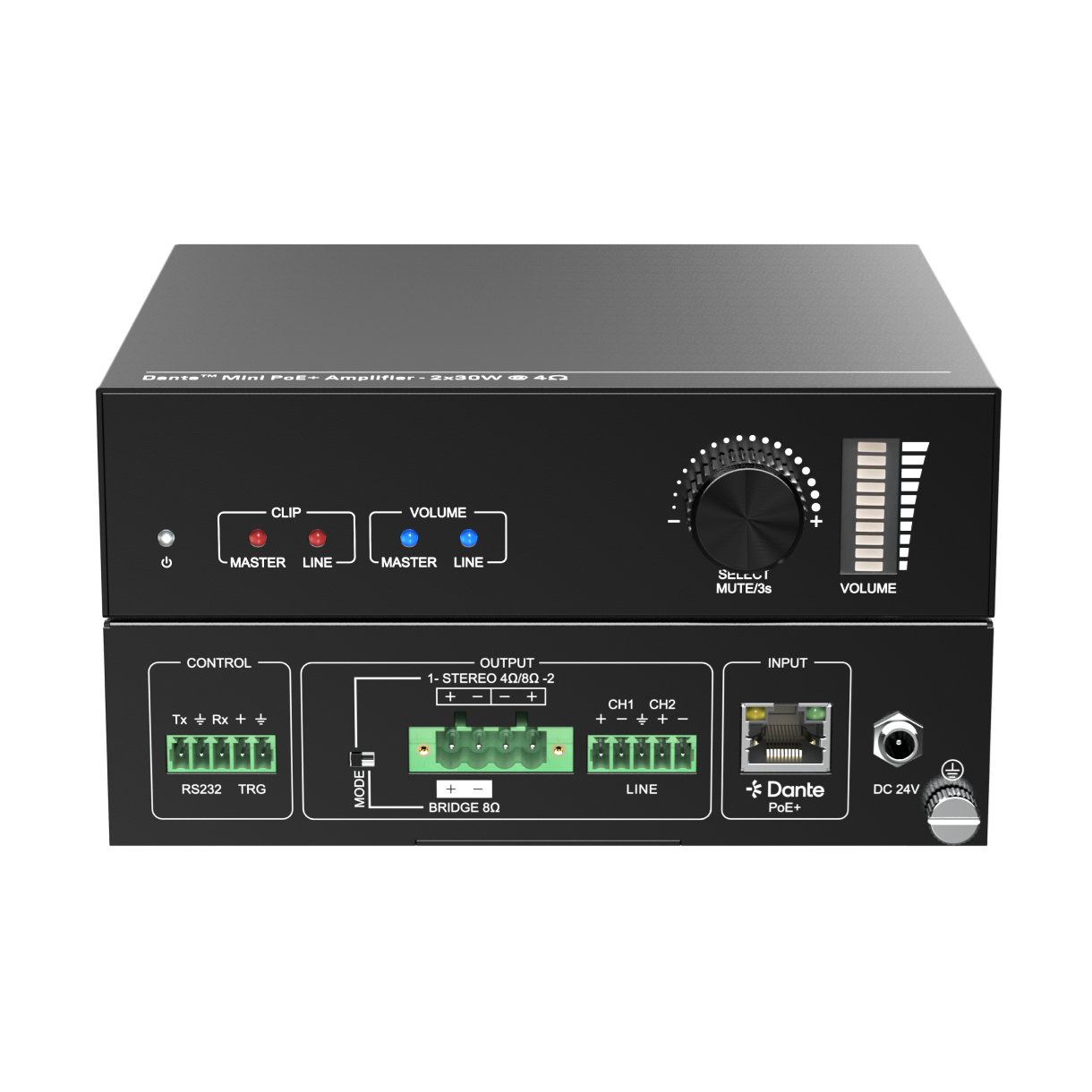 QAA DA230 – двухканальный усилитель мощности c поддержкой Dante. Два выходных канала мощностью по 30 Вт (при нагрузке 4 или 8 Ом) или один мощностью до 60 Вт в мостовом режиме. Есть выход неусиленного аудио. Управляется устройство по интерфейсу RS-485, с помощью триггерных портов. Питание усилителя осуществляется от внешнего блока питания 24 В (в комплект не входит) или по PoE+.
