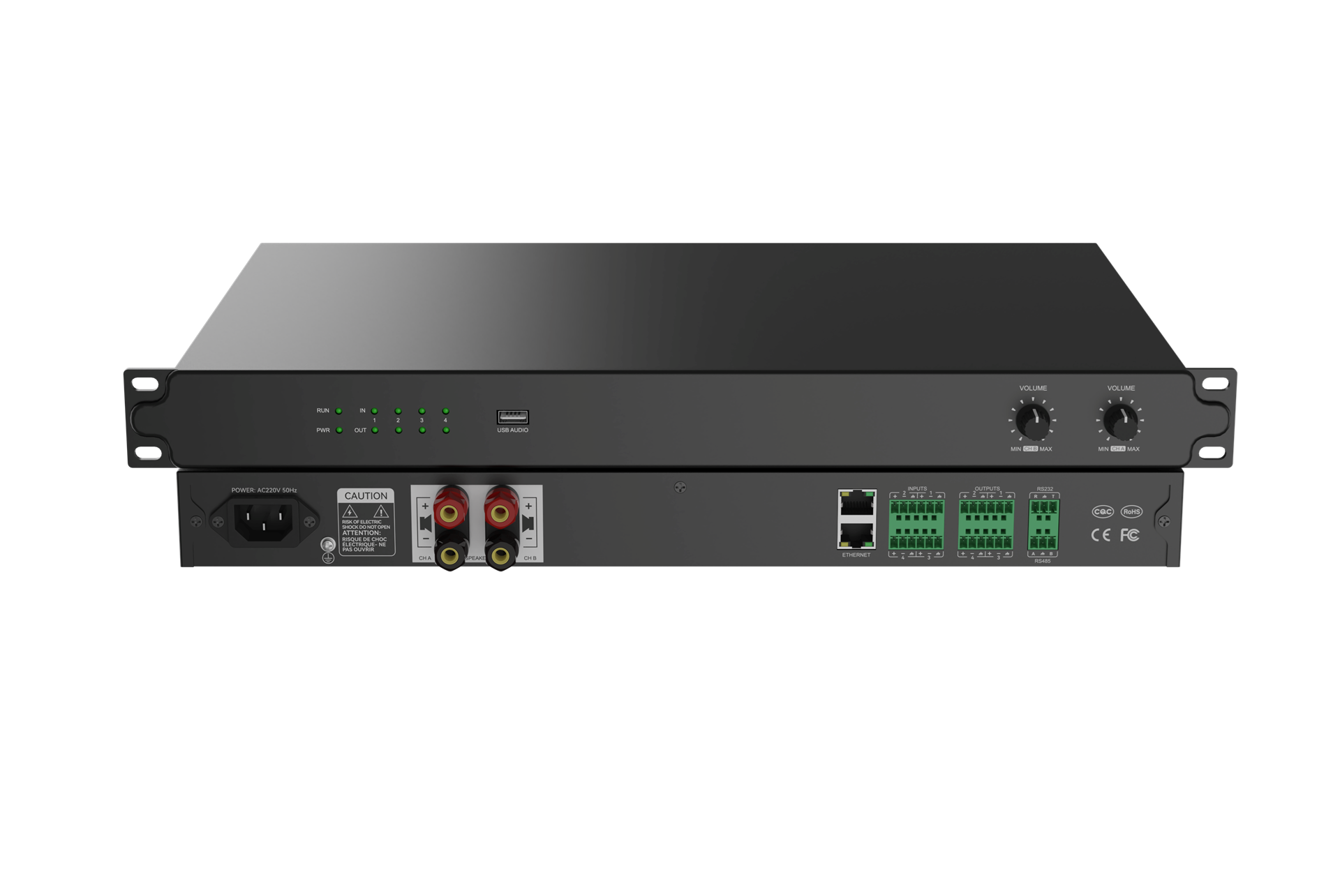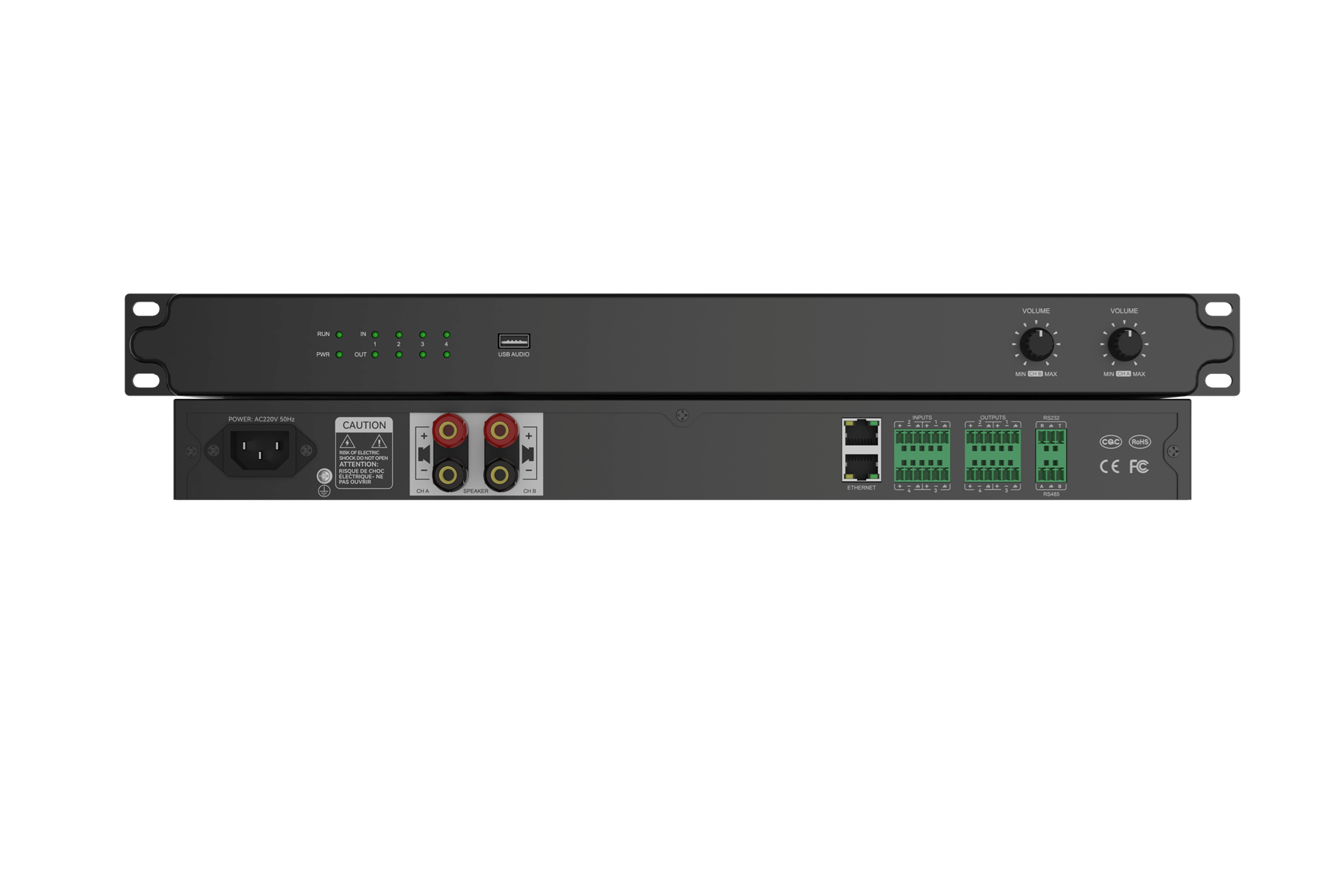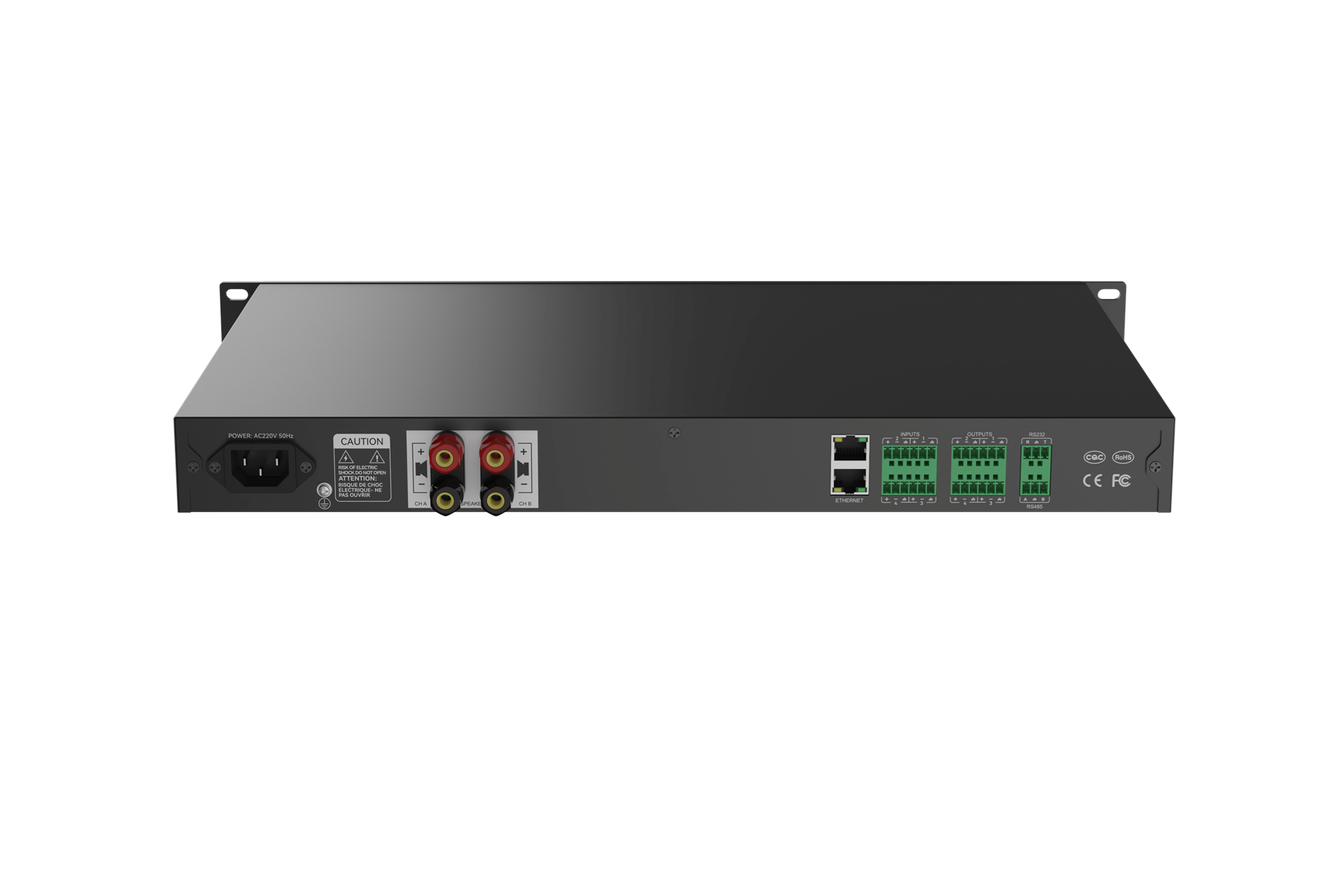 QAA MA2150V2P – усилитель мощности со встроенным цифровым сигнальным процессором, 2x150 Вт – 8 Ом, 1x300 Вт – 8 Ом (мостовой режим). Запоминает до 16 пресетов. Балансные микрофонные/линейные входы поддерживают раздельно включаемое фантомное питание 48 В. Управление осуществляются по RS-232, RS-485, IP с помощью специального ПО, которое размещено в памяти устройства и доступно для скачивания в компьютер пользователя при прямом подключении к дефолтному IP адресу 169.254.10.227 (например, через USB порт). Возможно подключение пейджингового микрофона для сообщений с зональной адресацией, а также настенных контроллеров серии QAI DCON, программируемых с использованием графического Drag-and-Drop интерфейса. Корпус для монтажа в стойку, высота 1U.