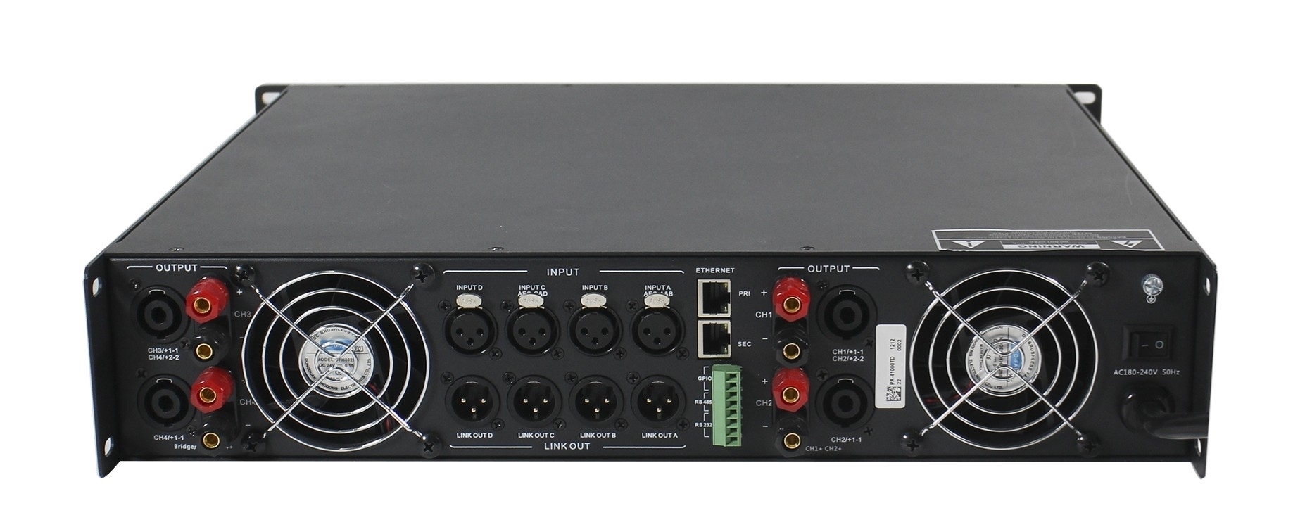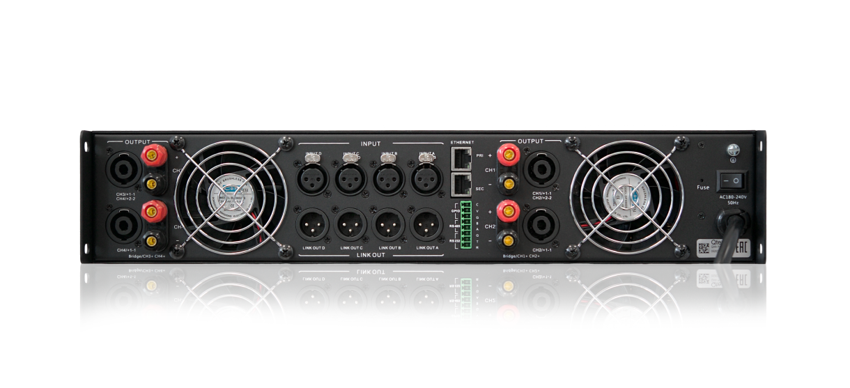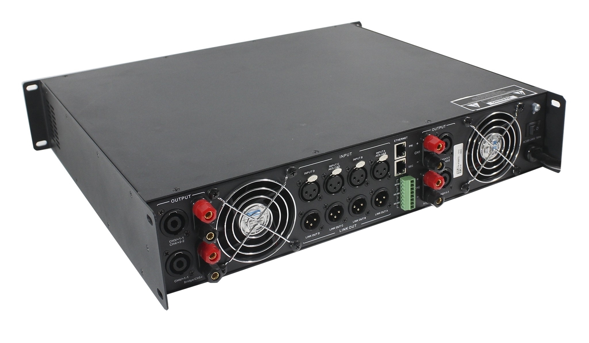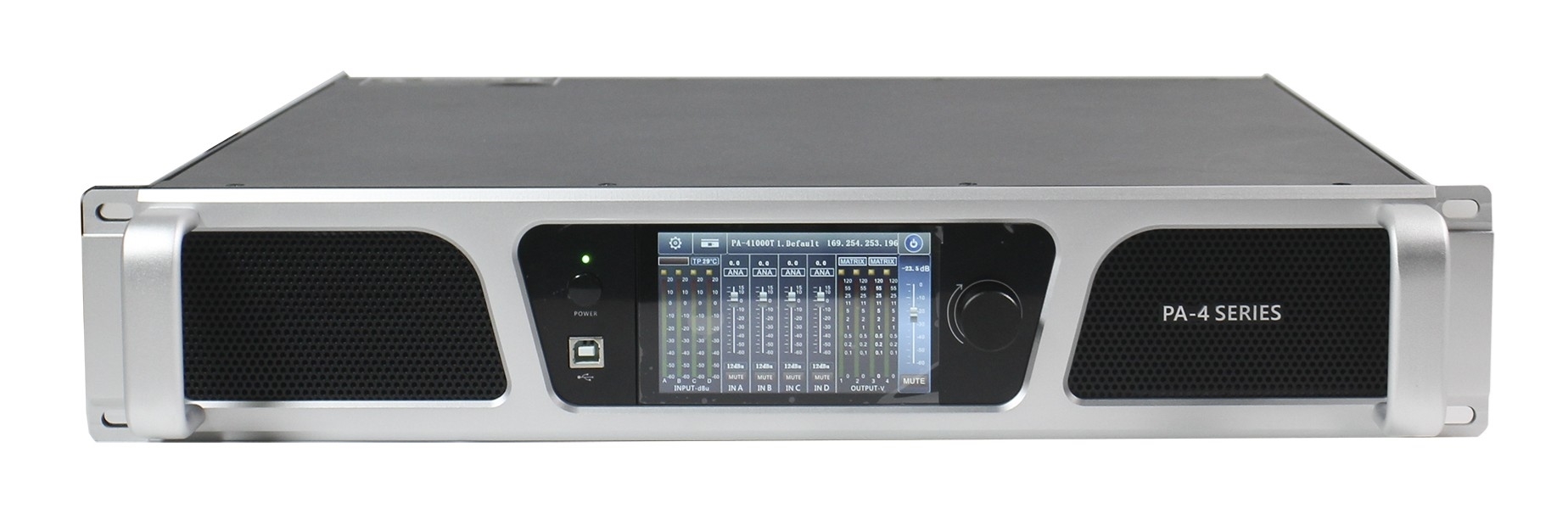 QAA PA41500TDV2 – четырехканальный усилитель мощности, оснащенный Dante и DSP-процессором. Выходная мощность 4х1500 Вт/8 Ом, 4х2000 Вт/4 Ом, 4x600 Вт – 70 В, 4x1250 Вт – 100 В, в мостовом режиме 2х3200 Вт/8 Ом. Цифровые FIR фильтры, параметрический эквалайзер, компрессор, лимитер, гейт, временная задержка сигнала, схемы защиты выхода. Управление устройством осуществляется по IP, RS-232, RS-485, USB. Высота 1U.
