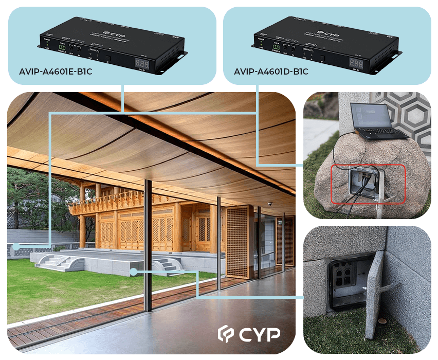 Ответом на эти требования стала техника CYP и передача AV-сигналов по IP. Передатчики AVIP-A4601E-B1C и приемники AVIP-A4601D-B1C обеспечивают стабильную передачу 4K60-видео и аудио по сети с минимальной задержкой. Управление всеми зонами осуществляется через IP-контроллер CDPS-CS11, который объединяет передающие устройства в единую виртуальную матрицу. Поддержка PoE, компактное исполнение и низкий уровень тепловыделения позволили скрыть часть оборудования в декоративных элементах двора — в декоративных камнях и за потайными дверцами, не влияя на внешний облик зданий.
