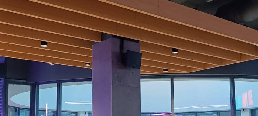 Акустический расчет показал: для такого объекта подойдет только продуманная гибридная система. Большую часть работы по проигрыванию музыки взяли на себя 6,5″ акустические системы eAMBIT106BK от Ecler — их установили 30 штук. После покрытия основной площади точечную нагрузку взяли на себя встраиваемые eIC52, а также тандем активной акустики от Studiomaster, АС VORTEX12A и сабвуферы VORTEX15SA. Подобранные специально под зоны озвучивания на объекте, громкоговорители составили гармоничную звуковую картину на всей территории спортивного клуба.