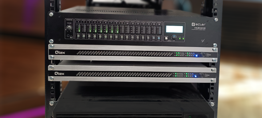 Сердцем системы стала цифровая матрица аудиосигналов Ecler HUB1616. Оборудованная 16×16 входами и выходами, встроенным DSP-аудиопроцессором и портами для удаленного управления, она взяла на себя контроль системой. В удобных точках расположились настенные контроллеры eMCONTROL1, а за усиление звука отвечают модели от QtexQAA PD4240V2 и QAA PD4500V2.