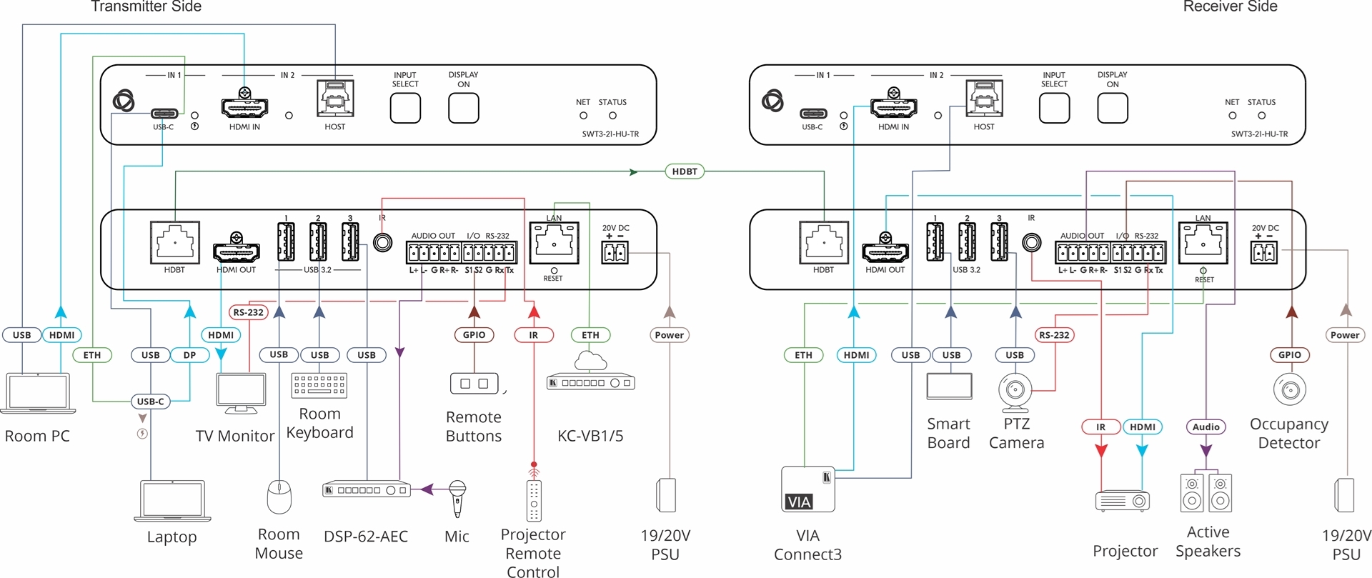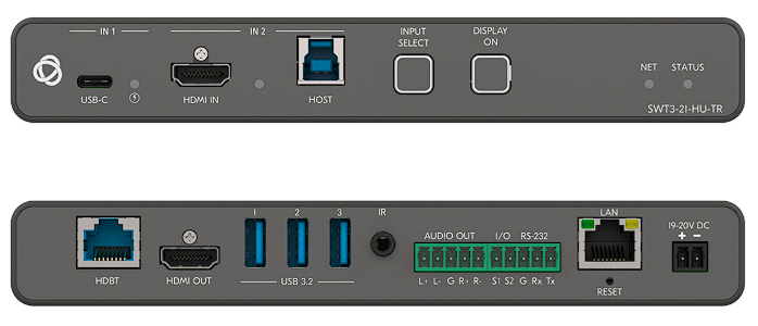 SWT3-21-HU-TR – автокоммутатор 2х1, оборудованный входами HDMI/USB и USB-C и выходом HDMI. Использует порт HDBaseT, который может быть гибко настроен как вход или выход для передачи сигналов HDMI, USB 2.0, Ethernet, RS−232 и ИК. Осуществляет коммутацию сигналов высокой четкости с разрешением до 4K60 (4:4:4). Оборудован деэмбеддером аудио. Также есть три входа USB-A для подключения периферийных устройств. Поддерживает передачу питания с использованием протокола PoE (Power over Ethernet).