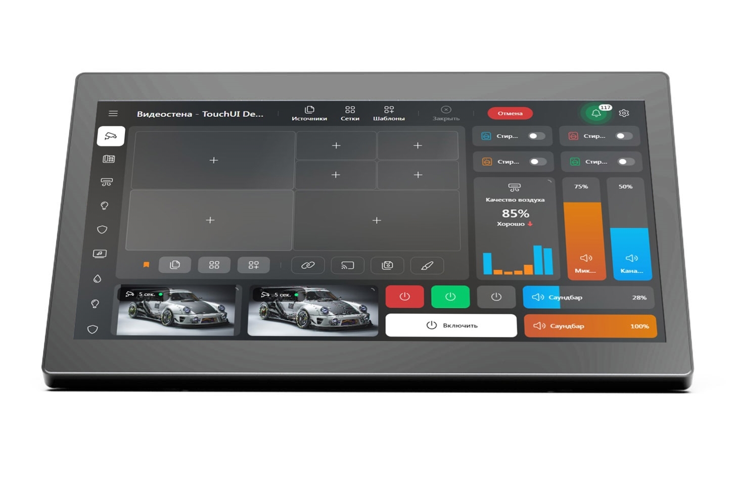 Touch – сенсорная панель для управления контроллерами видеостен, ВКС-оборудованием, PTZ-камерами и IoT-оборудованием. Модель оборудована 10'' сенсорным экраном разрешением 1920х1200. Работает под управлением ОС Android. Возможно беспроводное подключение по Bluetooth и Wi-Fi.