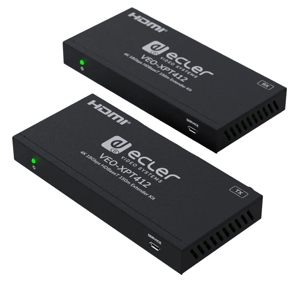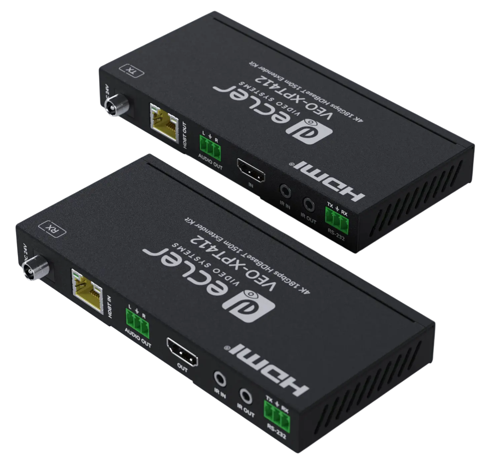 VEO-XPT412 — комплект из передатчика и приемника, предназначенный для удлинения сигналов интерфейса HDMI по витой паре HDBaseT. Поддерживает разрешения до 4K60 (4:4:4). Поддержка основных цифровых аудиокодеков/форматов: LPCM 2.0/5.1/7.1, DTS 5.1, Dolby TrueHD, Dolby Digital и DTS-HD Master Audio. Расстояние передачи до 150 м для 1080p, до 120 м для 4К. Двунаправленная передача сигналов управления ИК и RS-232.